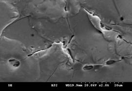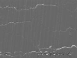 現溼式之磨料對SKD61模具鋼的放電表面,如圖3、圖4所示,有大幅度改善至近似鏡面效果。對於一般之研磨表面則如圖5所示,